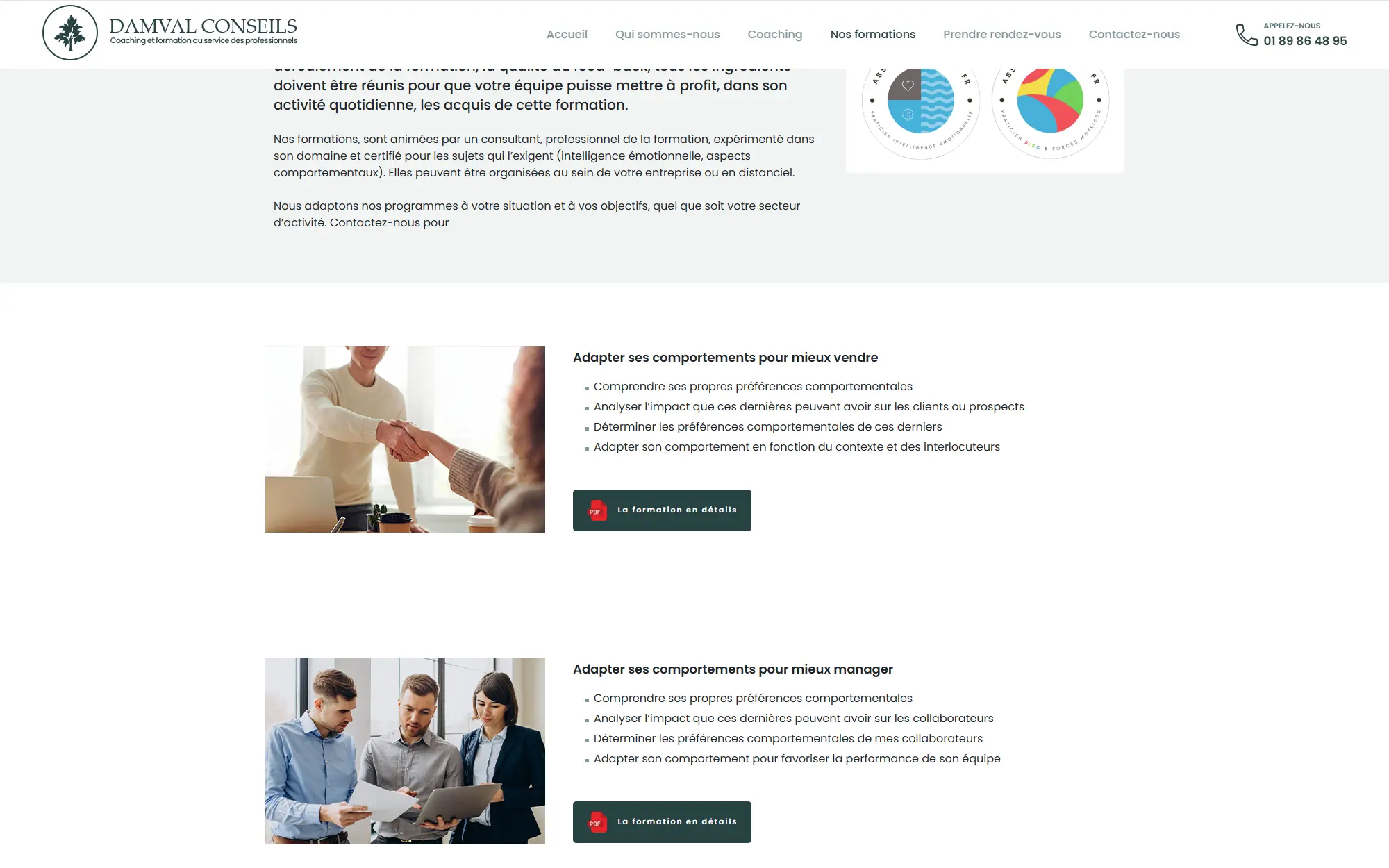 Fiches formations au format PDF, téléchargeables directement depuis le site — un argument de réassurance fort pour les DRH et responsables formation.